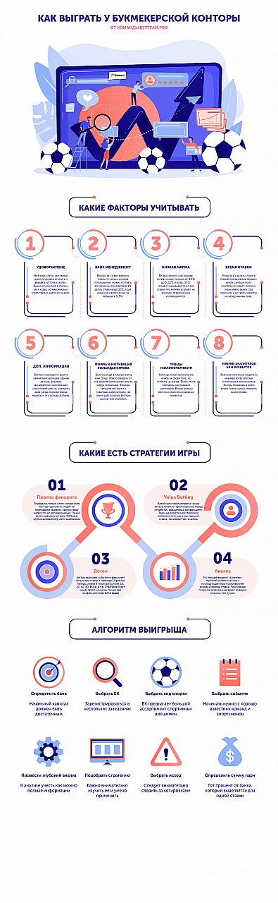 Букмекерские конторы ведут свою деятельность ради прибыли, а игрок сам должен позаботиться о том, чтобы обыграть систему. Но это довольно тернистый путь и нужно быть готовым эмоционально и психологически. Любое решение должно быть выверенным, и если не уверены в выбранном варианте для пари, откажитесь от него вообще. Ставьте только, когда имеете для этого веские аргументы, и никогда не надейтесь на удачу. Хорошему анализу всегда мешают эмоции, и нужно от них избавляться. Выработайте способность трезво мыслить и примите следующие факты за аксиому: