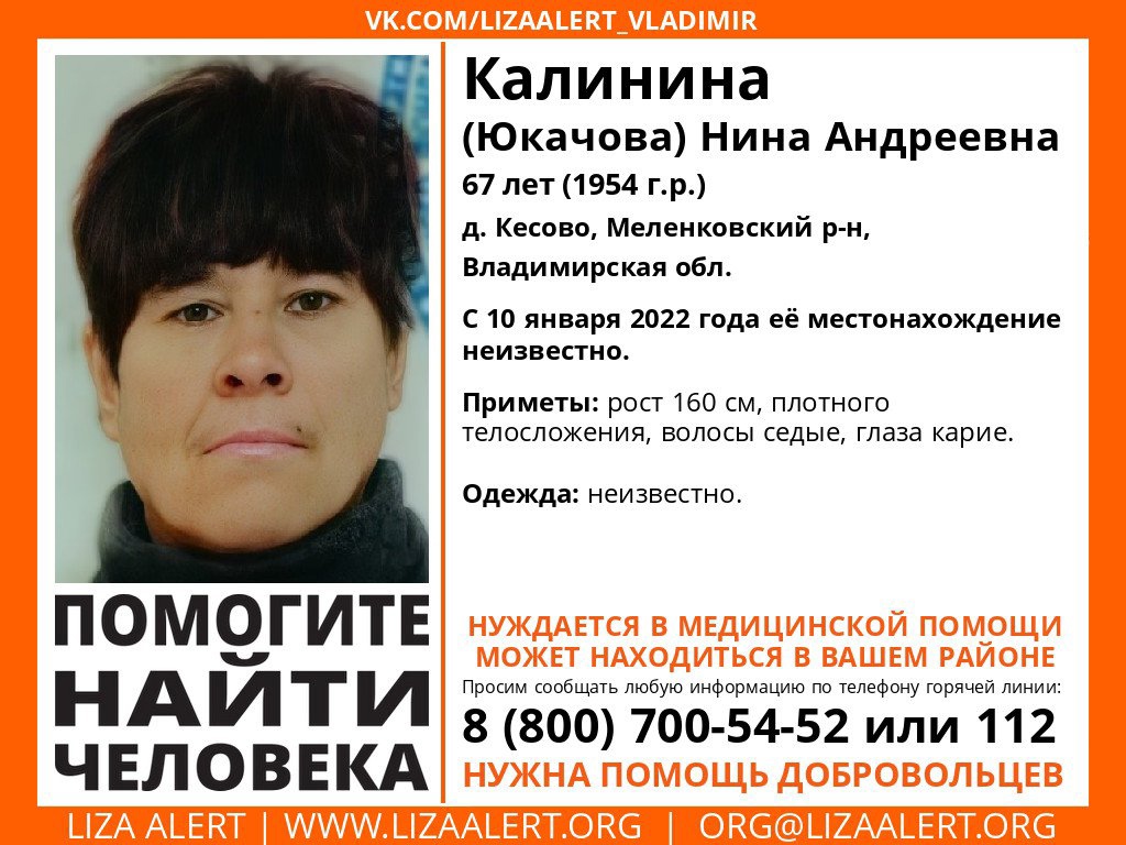 Пропала Калинина (Юкачова) Нина Андреевна 1954 г.р. (67 лет), д. Кесово, Меленковский р-н, Владимирская обл.