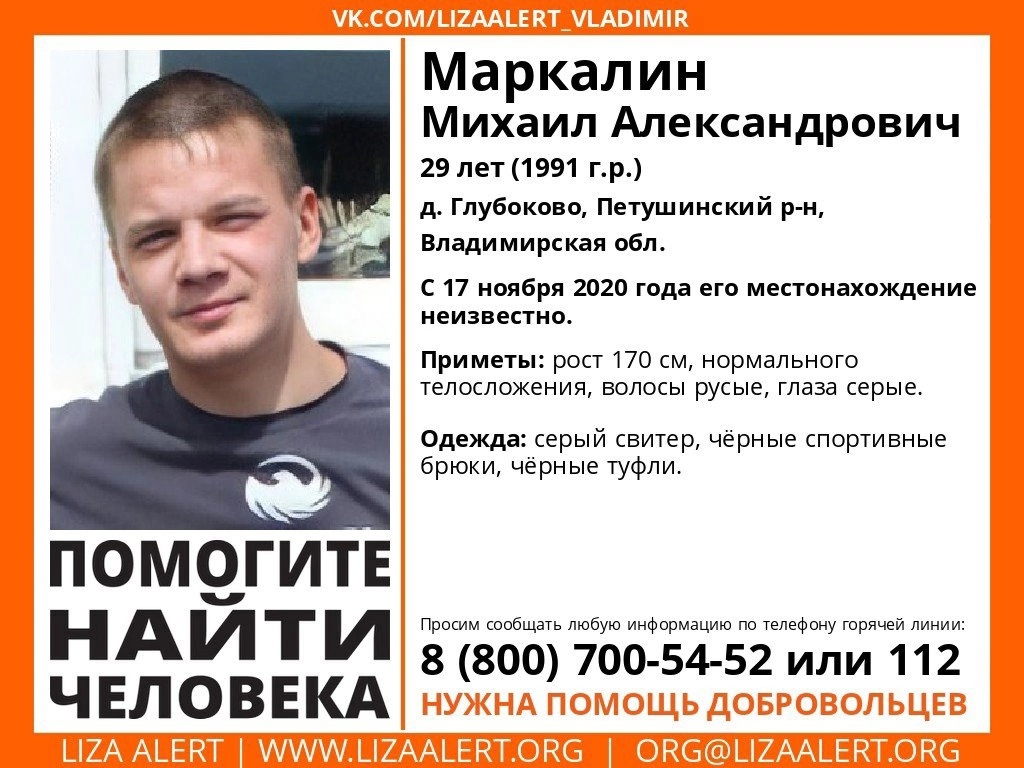 Пропал Маркалин Михаил Александрович 1991 г.р. (29 лет), д. Глубоково, Петушинский р-н, Владимирская обл.