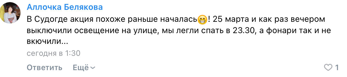 Пользователи соцсетей рассказали, что походу уже такая акция проводилась. Например, в Судогде чиновники не ограничились одним часом и выключили свет на ночь.