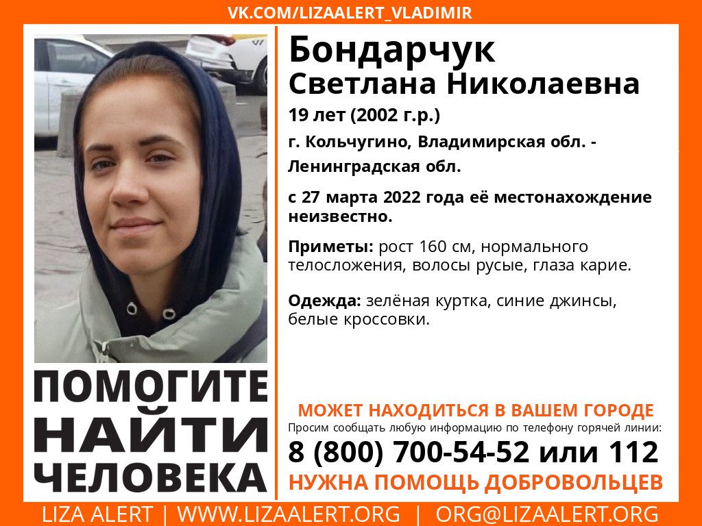 Отряд "ЛизаАлерт" объявил в розыск Светлану Бондарчук. Она пропала без вести 27 марта, но известно, что она может находиться как во Владимирской области, так и в Ленинградской.