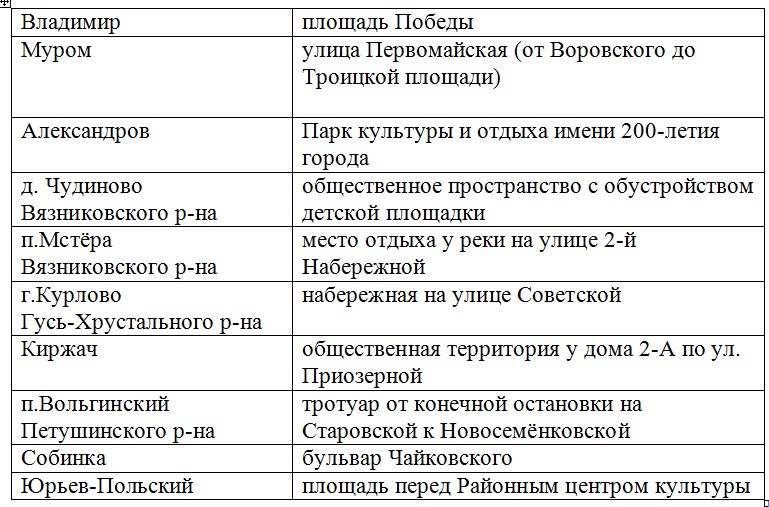 в Гусь-Хрустальном – сквер у памятника В.И. Ленину, в Кольчугине – сквер им. Ленина на ул.Алексеева, в Костереве – 2-й этап реконструкции городского стадиона «Труд», в Красной Горбатке – пляжная зона в рамках реконструкции Надречного парка «Землянина».