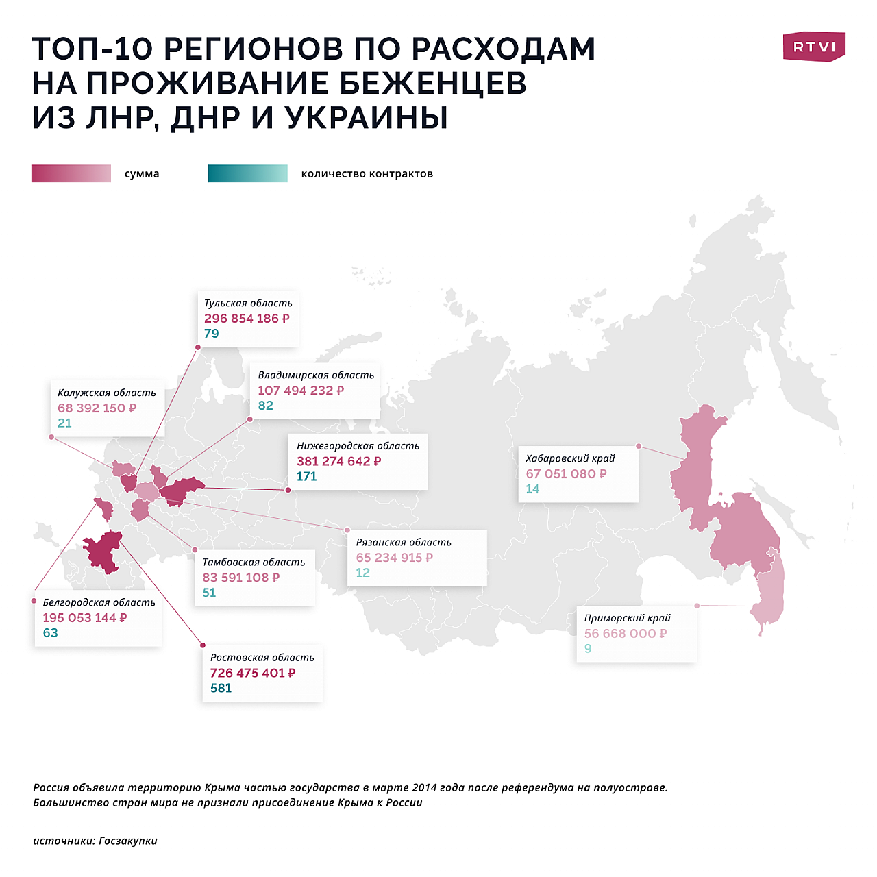 Владимирская область попала в топ-10 регионов с самыми высокими расходами (расположилась на 5 месте). Здесь с февраля этого года на организацию питания, расселение, транспортировку и прочие нужды вынужденных переселенцеев потратили около 107,5 миллионов рублей; было заключено 82 контракта.