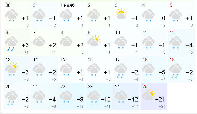 По их словам, в первые 8 дней температура воздуха будет составлять +1...+5 градусов Цельсия (раньше сообщалось о +10). Затем столбик термометра будет показывать -1...-4 градусов Цельсия. С 22 числа ожидается очередное похолодание: до -9...-11. Самым холодным днем будет 25 ноября: -21 градус днем и столько же ночью.