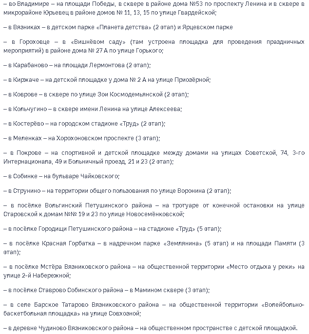 Кроме того, в ноябре планируют завершить благоустройство еще 9 общественных территорий: в Муроме, Коврове, Гусь-Хрустальном, Александрове, Камешково, Судогде, Юрьеве-Польском и Никологорах Вязниковского района.
