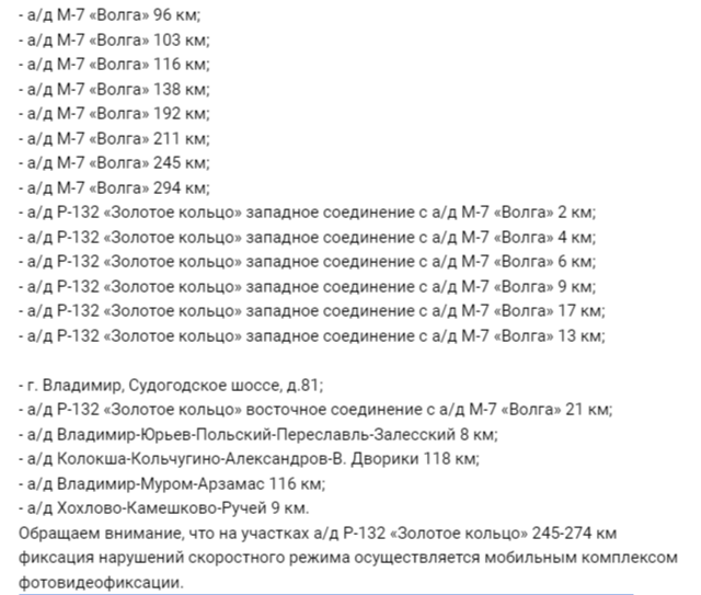 С 26 августа по 31 августа во Владимирской области будут работать комплексы фотовидеофиксации. Список мест опубликовали в региональном министерстве транспорта и дорожного хозяйства. Камеры разместят на следующих участках дорог: