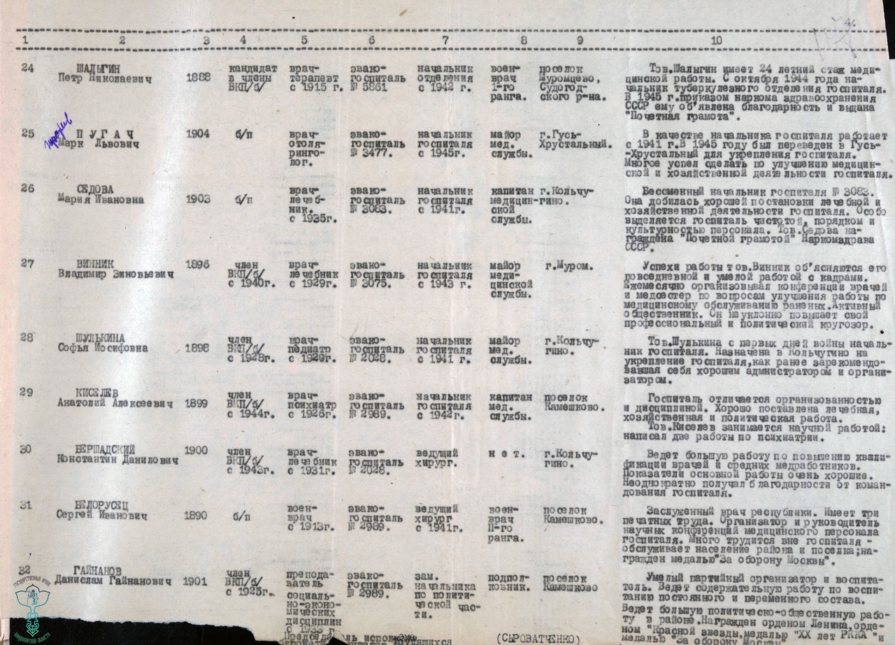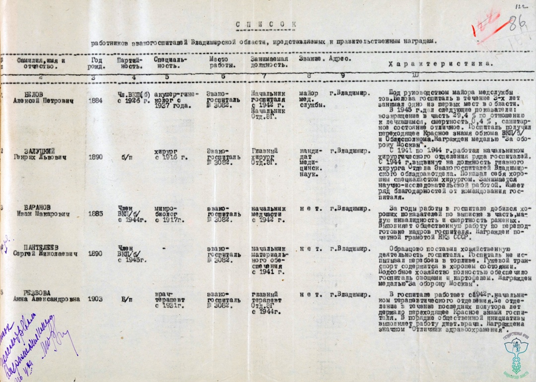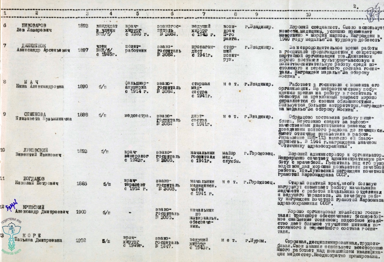 В победном 1945 году группа наиболее отличившихся медицинских работников владимирских эвакогоспиталей была представлена к государственным наградам. Майор медицинской службы С.П. Белов лично составлял списки медиков, представленных к наградам. Сегодня, в преддверии 80-летия Победы, мы публикуем этот уникальный исторический документ, сохранивший имена тех, кто сутками стоял у операционных столов, борясь за жизнь каждого бойца. Их подвиг заслуживает вечной памяти. Документ опубликован в группе "Государственный архив Владимирской области"