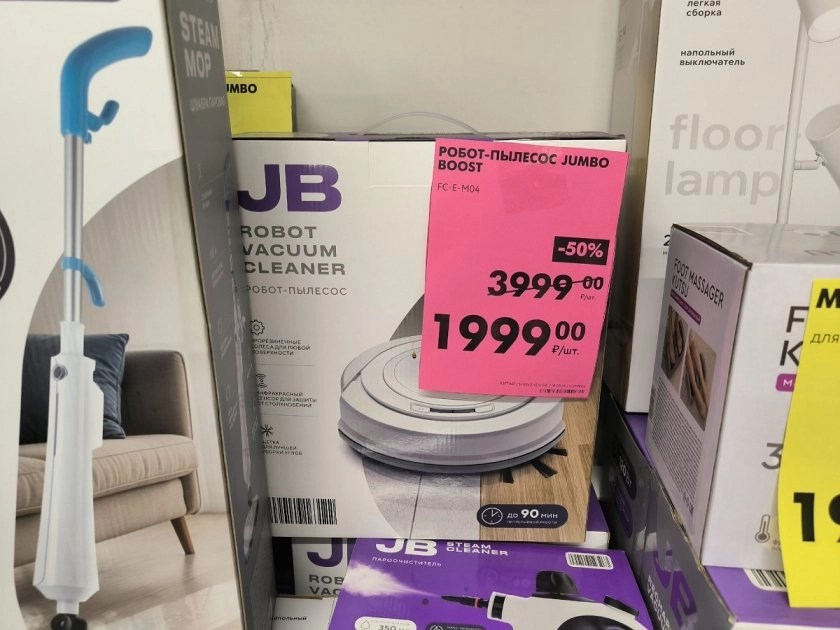 Мой главный фаворит — это робот-пылесос. Честно, когда увидела ценник, не поверила глазам: всего 1999 рублей вместо 3999! Скидка 50%. Взяла не думая. Для своей стоимости он просто молодец: есть влажная уборка, работает минут 90 без подзарядки, пульт в комплекте. Освобождает кучу времени — запустил и забыл.