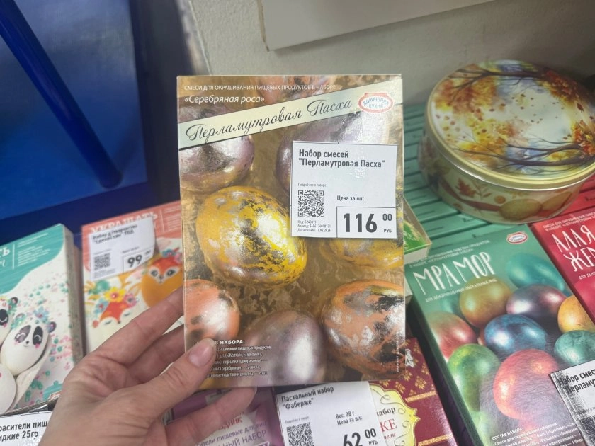 Фишка: краски взаимодействуют с фольгой. Сначала краситель втирается, затем яйцо покрывается фольгой — и появляется серебряный отлив. Выглядит дорого и празднично.