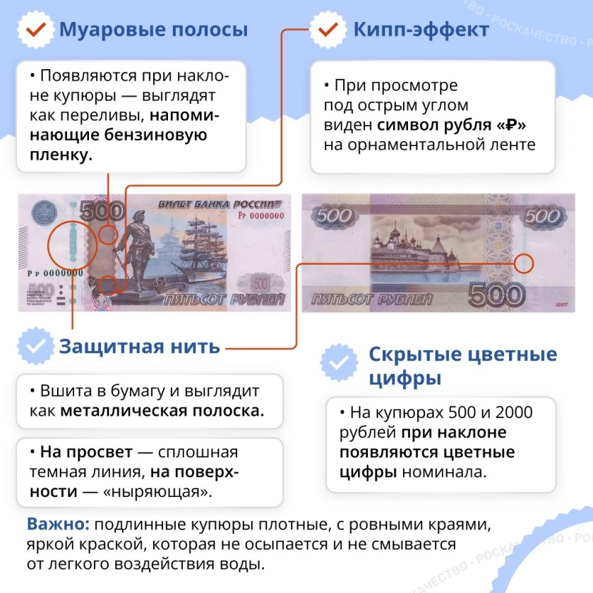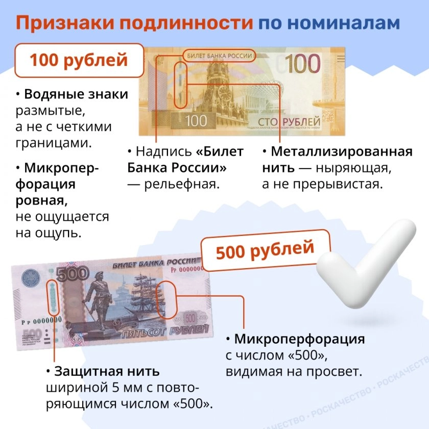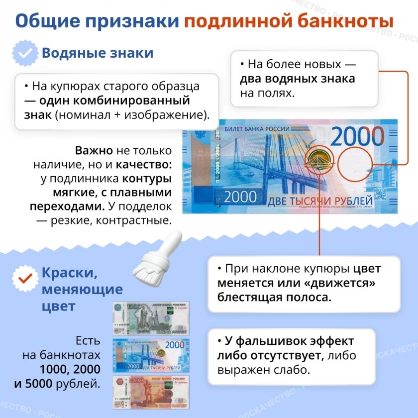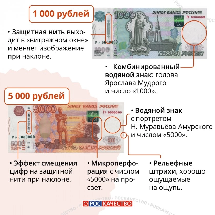 Впрочем, обезопасить себя можно без специального образования и дорогих приборов. Достаточно запомнить несколько чётких ориентиров от Роскачества, на которые стоит взглянуть сразу после того, как купюра оказалась у вас в руках.