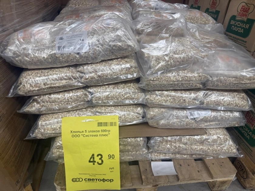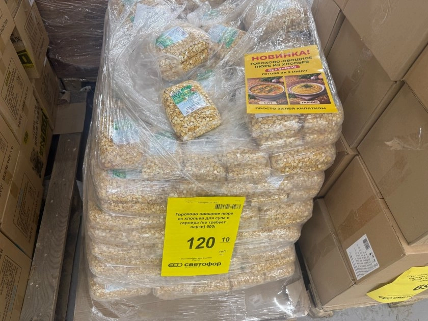 В бакалейном отделе заметила ещё три новинки из сегодняшнего завоза: горохово-овощное пюре из хлопьев за 120 рублей, хлопья «5 злаков» за 43,90 и мука пшеничная, два килограмма, за 74,40. У муки на ценнике отдельно прописан вес, а у хлопьев и пюре — просто название и цена.