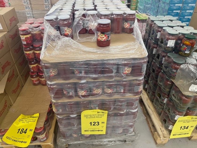 Сворачиваю в овощной ряд. Томатная паста за 123,90 и банка ассорти из томатов и огурцов за 134,80 - ходовые продукты в нашем доме. Беру без раздумий, тем более стоимость в разы ниже, чем в других сетевых.
