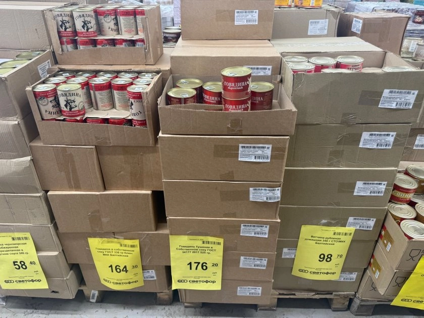 На отдельной полке стоят консервы и ветчина. Говядина в собственном соку — 164 рубля, тушёная говядина чуть дороже, 176, а ветчина рубленая домашняя — всего 98. Разница между двумя видами говядины — копейки, одиннадцать рублей. Ветчина ощутимо дешевле. Товар выложили ровно, видно, что только что из коробок.